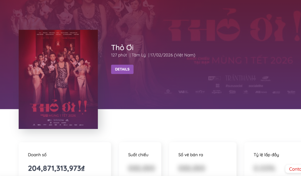 Theo số liệu từ Box Office Vietnam, tính đến 22h tối ngày 21/2 (tức mùng 5 Tết Bính Ngọ 2026), “Thỏ ơi!” đã vượt mốc 204 tỷ đồng. Trước đó, phim liên tục lập loạt kỷ lục ấn tượng như: tác phẩm Việt có lượng vé đặt trước cao nhất mọi thời đại với hơn 130.000 vé và đạt doanh thu mở màn 50 tỷ đồng chỉ trong chưa đầy 24 giờ công chiếu.