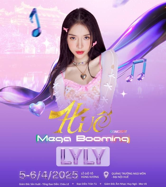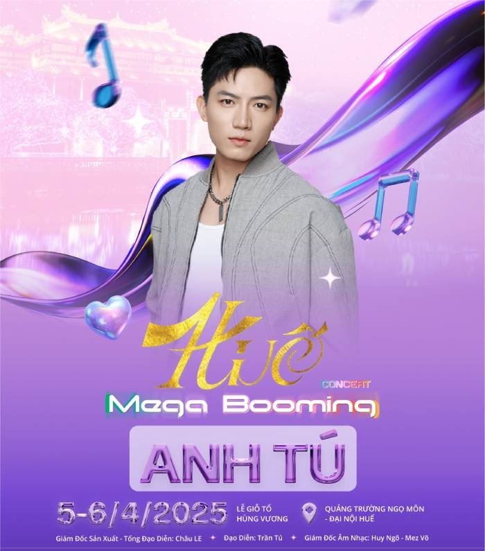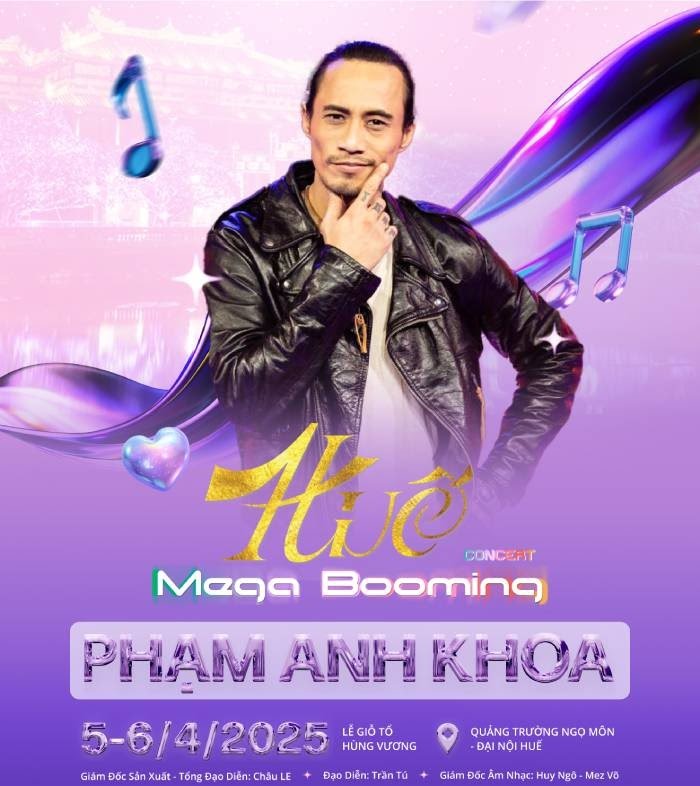Đại nhạc hội "Huế Mega Booming" - sự kiện âm nhạc quy mô lớn diễn ra trong hai đêm liên tiếp vào ngày 5 - 6/4/2025 tại Quảng trường Ngọ Môn, Thành phố Huế hứa hẹn mang đến trải nghiệm âm nhạc độc đáo kết hợp giữa truyền thống và hiện đại, thu hút giới trẻ và khách du lịch đến với Cố đô Huế nhân dịp Giỗ Tổ Hùng Vương 2025.
