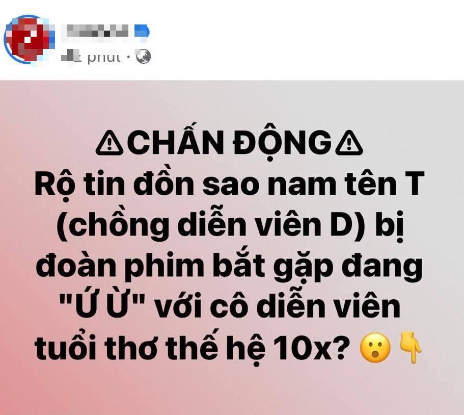 Chiều 1/8, mạng xã hội bất xôn xao thông tin đầy ẩn ý: "Rộ tin đồn sao nam tên T, chồng diễn viên D bị đoàn phim bắt gặp đang tình thương mến thương với cô diễn viên tuổi thơ thế hệ 10X?".