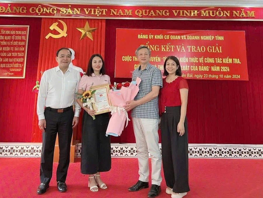 Năm 2024, cô giáo Trịnh Thu Hà (thứ hai từ bên phải sang) nhận giải Nhất tuần 4 Cuộc thi trực tuyến “Tìm hiểu kiến thức về công tác kiểm tra, giám sát và thi hành kỷ luật của Đảng” do Đảng ủy Khối cơ quan và doanh nghiệp tỉnh tổ chức. (Ảnh: NVCC)