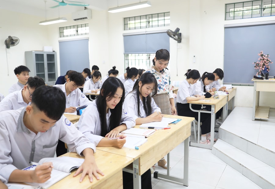 Giáo viên Trường Trung học phổ thông Tự Lập (xã Tiến Thắng) hướng dẫn học sinh ôn tập. Ảnh: Nguyễn Quang