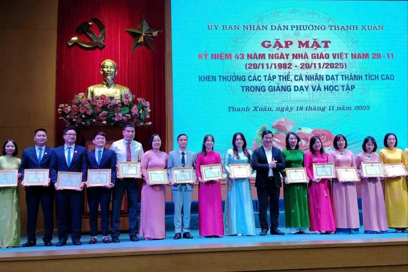 Các thầy, cô giáo được UBND phường Thanh Xuân biểu dương, khen thưởng. Ảnh: Tuấn Việt