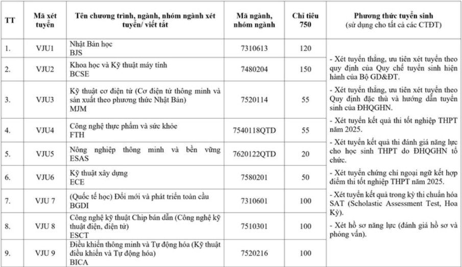Trong năm học 2025, VJU dự kiến tuyển 750 sinh viên. Ba ngành học mới được giới thiệu bao gồm: Công nghệ kỹ thuật chip bán dẫn; Điều khiển thông minh và tự động hóa; Đổi mới và phát triển toàn cầu (Quốc tế học). Đặc biệt, ngành Công nghệ kỹ thuật chip bán dẫn đặt ra yêu cầu khá cao: thí sinh cần đạt tối thiểu 24/30 điểm tổng ba môn trong tổ hợp xét tuyển và môn Toán phải đạt tối thiểu 8/10 điểm.