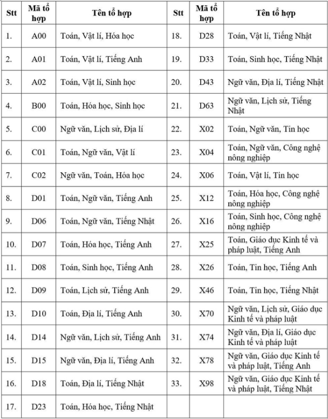 33 tổ hợp xét tuyển năm 2025.