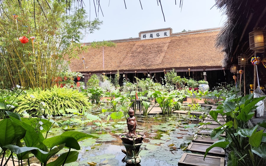 Cảnh quan của chùa mang đậm nét làng quê Bắc Bộ với ao sen, vườn cây, nhà lợp bằng lá guột, bàn trà, chum tương, giàn gỗ... Ở giữa ao sen có bàn trà để du khách ngồi thưởng trà, ngắm cảnh. Bên cạnh đó, chùa còn bố trí nhiều không gian lý tưởng để du khách nghỉ chân, tận hưởng thiên nhiên.