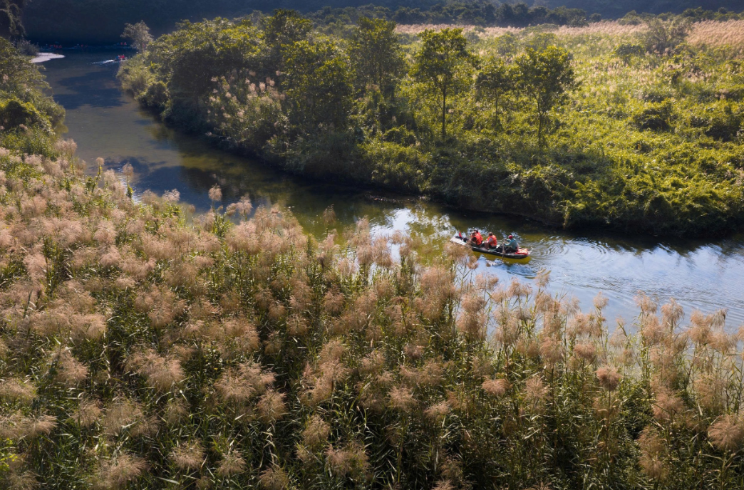 Thuyền chở du khách tham quan len qua những bãi lau ven sông trong không gian yên bình của Tràng An. Ảnh: Ngọc Linh