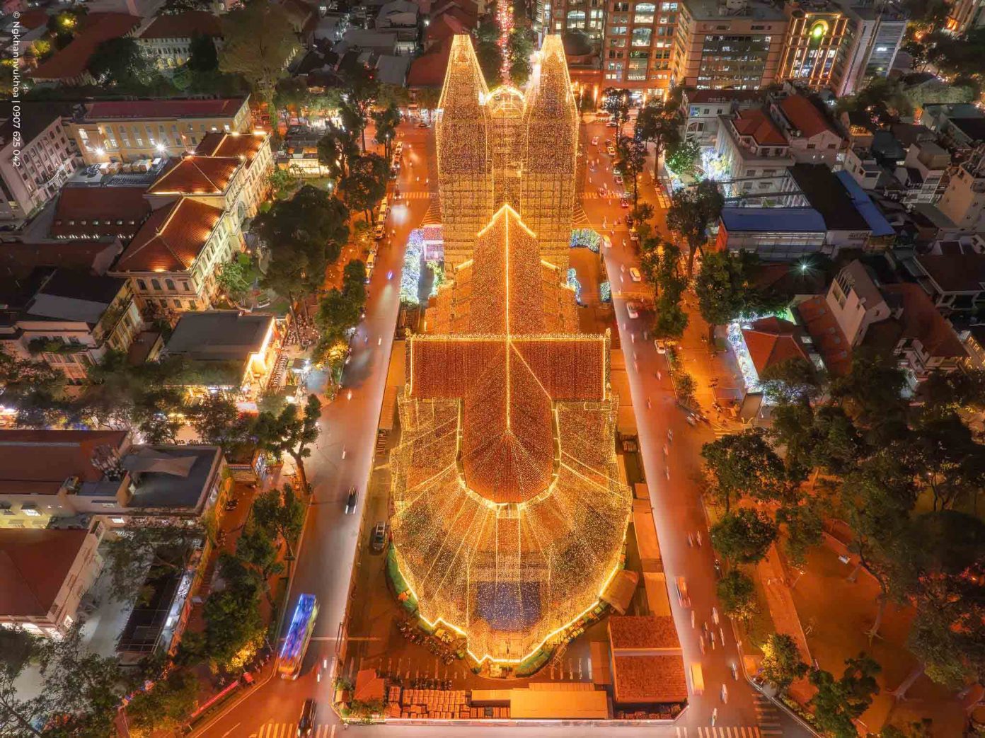 Với 500.000 mét đèn LED bao phủ hai tháp chuông cao 60m và xung quanh nhà thờ, khi màn đêm buông xuống, nơi đây trở thành điểm nhấn rực rỡ giữa trung tâm TPHCM. Ảnh: Nguyễn Khánh Vũ Khoa