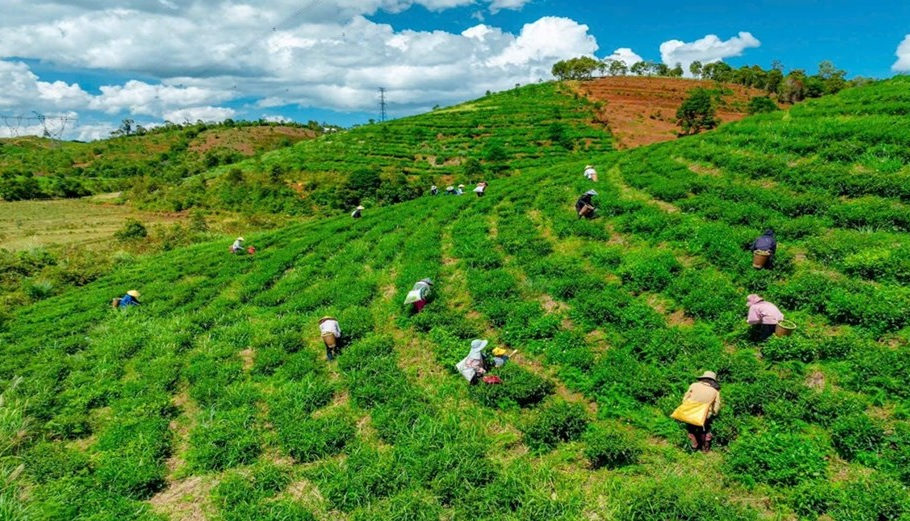 Công nhân Hợp tác xã Chè sạch Trường Sơn Đông đang thu hái lá chè