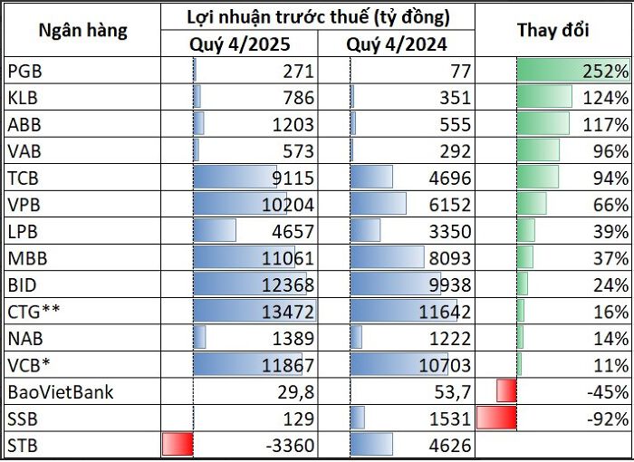Cập nhật kết quả kinh doanh ngành ngân hàng: Nhiều nhà băng báo lãi tăng gấp đôi trong quý IV/2025