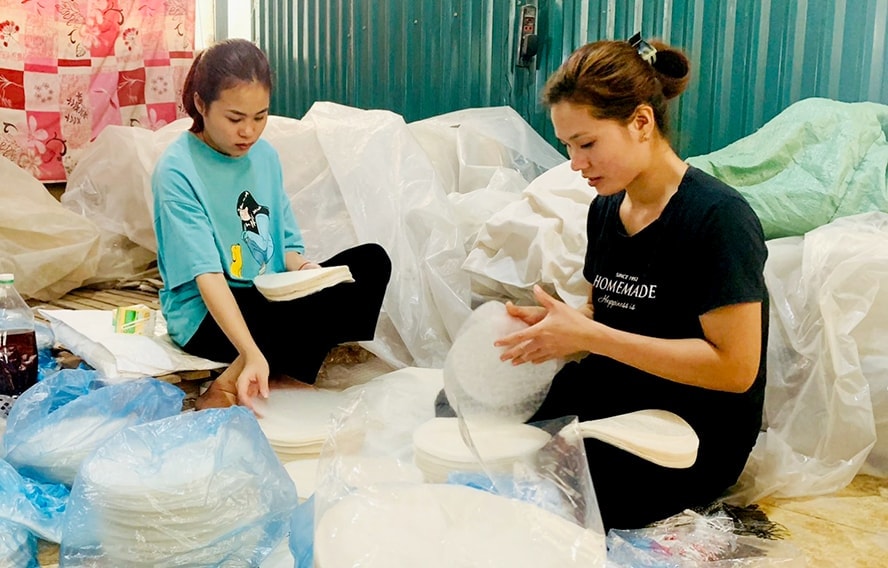 Đóng gói bánh đa nem tại thôn Ngự Câu. Ảnh: Nguyễn Mai