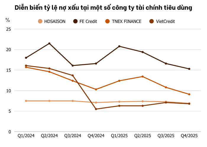 FE Credit hiện là một trong những công ty tài chính tiêu dùng có tỷ lệ nợ xấu (NPL) cao trong top đầu ngành. Tuy vậy, tại cuối năm 2025, tỷ lệ nợ xấu tại FE Credit đã giảm về mức 15,3%, cải thiện đáng kể so với mức đỉnh trên 21% hồi cuối năm 2022.