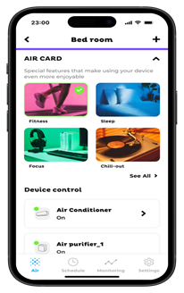 Điểm nổi bật của AIR CREATOR là khả năng tích hợp nhiều thiết bị trong cùng một hệ sinh thái thông qua AIR CARD. Dựa trên nhận định mỗi người có một “chuẩn thoải mái” khác nhau, người dùng có thể lựa chọn các chế độ phù hợp với từng bối cảnh sinh hoạt, và hệ thống sẽ tự động đồng bộ hoạt động giữa điều hòa và máy lọc không khí để tạo ra môi trường tối ưu, bao gồm: