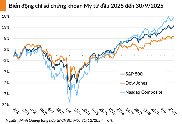 Ngày 30/9 cũng đánh dấu sự kết thúc của quý III. Chỉ số S&P 500 đã đi lên gần 8% trong quý, còn Nasdaq Composite ghi nhận mức tăng trưởng hơn 11%. Chỉ số Dow Jones tiến thêm hơn 5% kể từ cuối tháng 6, đánh dấu quý tăng trưởng thứ 5 liên tiếp.