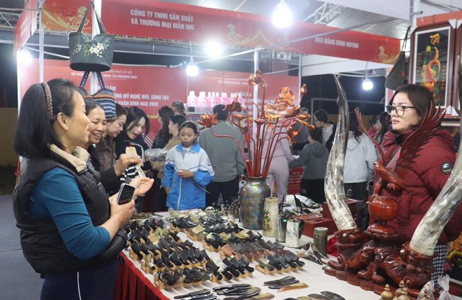 Khách mua hàng trong triển lãm các sản phẩm, mẫu thiết kế hàng thủ công mỹ nghệ mới, sáng tạo gắn với hoạt động phục vụ xuân Bính Ngọ 2026 tại xã Phượng Dực. Ảnh: Đỗ Đạt