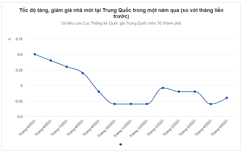 Cụ thể, theo số liệu được Cục Thống kê Quốc gia Trung Quốc công bố hôm 16/6, giá nhà mới tại 70 thành phố của Trung Quốc trong tháng 5 đã giảm 0,17% so với tháng 4. Mức giảm là 0,3% trong tháng 4.