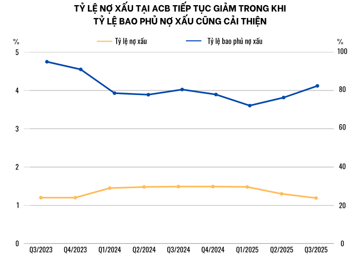 Tại thời điểm kết thúc quý III/2025, tỷ lệ nợ xấu (NPL) của ACB ở mức 1,12%, giảm từ mức 1,51% hồi đầu năm và nằm trong nhóm ngân hàng có tỷ lệ nợ xấu thấp nhất toàn ngành, gần tương đương với một số nhà băng nhóm Big4. Tỷ lệ nợ nhóm 2 ổn định ở mức khoảng 0,48%, đi ngang so với đầu năm. Tỷ lệ bao phủ nợ xấu tiếp tục cải thiện lên trên 80%.