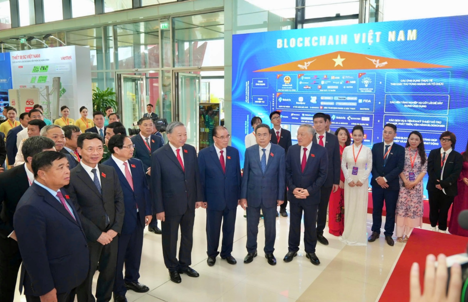 Các lãnh đạo Đảng, Chính phủ tham quan triển lãm và khu vực trưng bày Mạng Dịch vụ Đa chuỗi Blockchain Việt Nam.