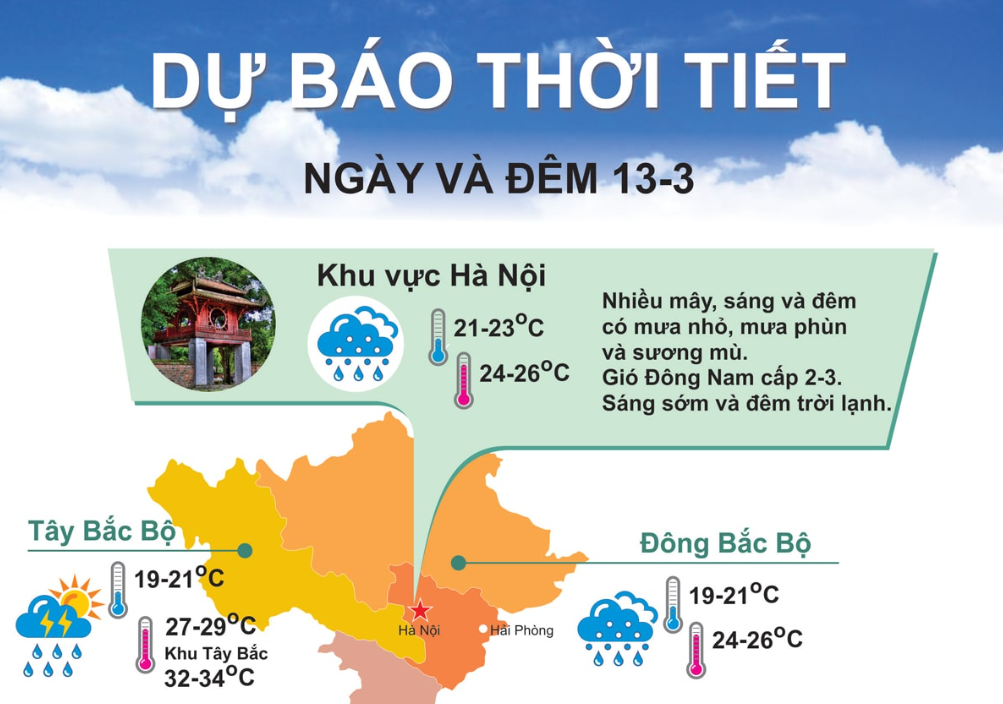 Bắc Bộ hôm nay (13-3) trời nhiều mây, sáng và đêm có mưa nhỏ, mưa phùn và sương mù. Độ ẩm không khí khu vực đồng bằng tiếp tục tăng cao. Sáng sớm và đêm trời lạnh.