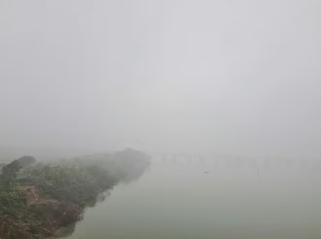Hà Nội sáng nay 1/12 sương mù giăng kín, đi trên cầu Chương Dương mà khó có thể nhìn thấy cầu Long Biên bên cạnh |
