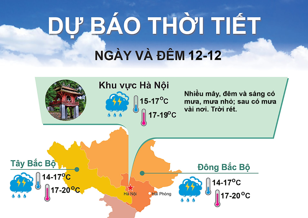 Ngày 12-12, Hà Nội nhiều mây, có mưa nhỏ vài nơi. Gió đông bắc cấp 3. Trời rét.