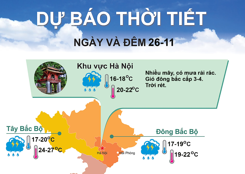 Ngày 26-11, Hà Nội nhiều mây, có mưa rải rác. Gió đông bắc cấp 3-4, trời rét.