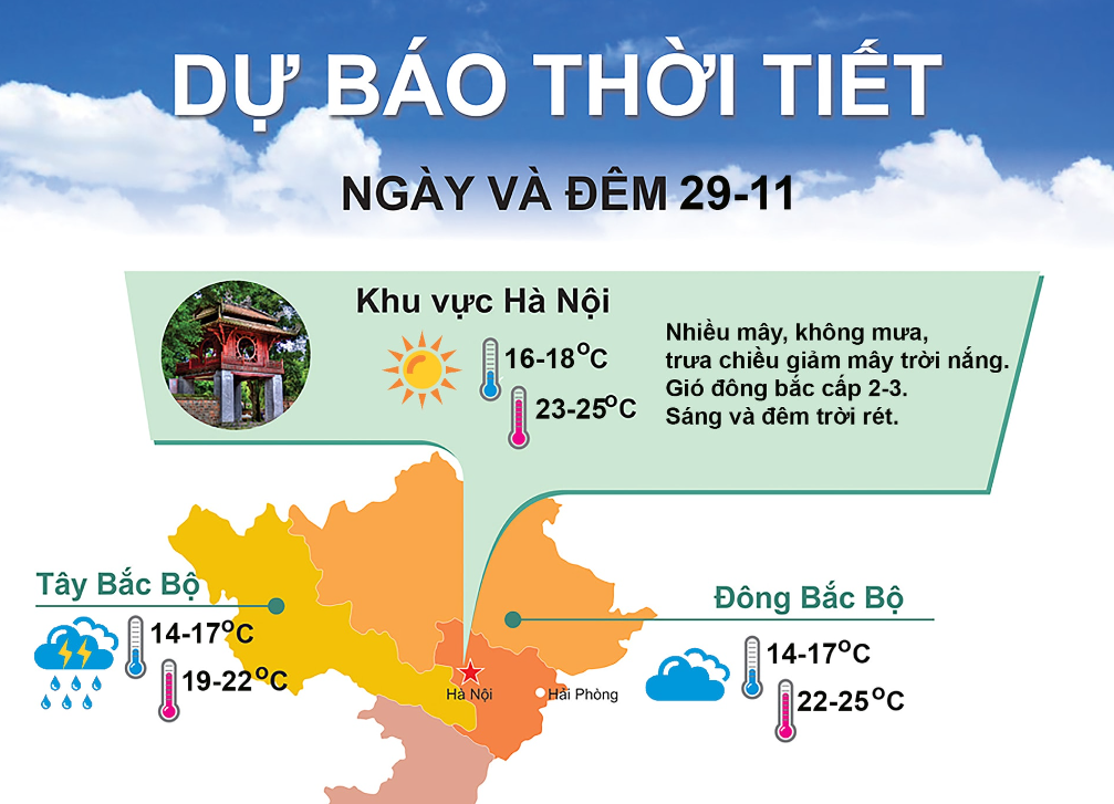 Hôm nay 29-11, Hà Nội nhiều mây, không mưa, trưa chiều giảm mây trời nắng. Gió đông bắc cấp 2-3. Sáng và đêm trời rét.