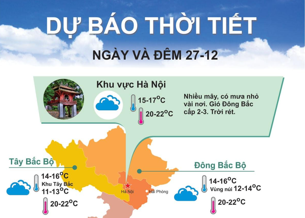 Hôm nay (27-12), Bắc Bộ và khu vực từ Thanh Hóa đến Thừa Thiên Huế trời tiếp tục rét, vùng núi Bắc Bộ có nơi rét đậm, rét hại. Nhiệt độ thấp nhất trong đợt không khí lạnh này ở Bắc Bộ và Bắc Trung Bộ phổ biến từ 12-15 độ C, vùng núi có nơi dưới 10 độ C.