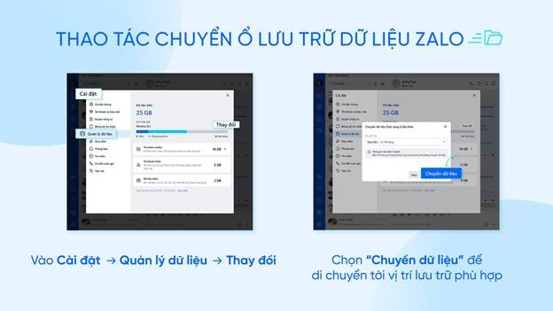 Để thực hiện chuyển dữ liệu, người dùng truy cập vào mục “Quản lý dữ liệu” trong phần cài đặt, lựa chọn “Thay đổi” để di chuyển dữ liệu Zalo của mình tới ổ lưu trữ phù hợp. Người dùng có thể hủy việc di chuyển dữ liệu bất kỳ lúc nào và dữ liệu vẫn sẽ được Zalo bảo toàn. Trường hợp thiết bị tắt giữa chừng khi đang chuyển dữ liệu, người dùng chỉ cần thao tác lại từ đầu.