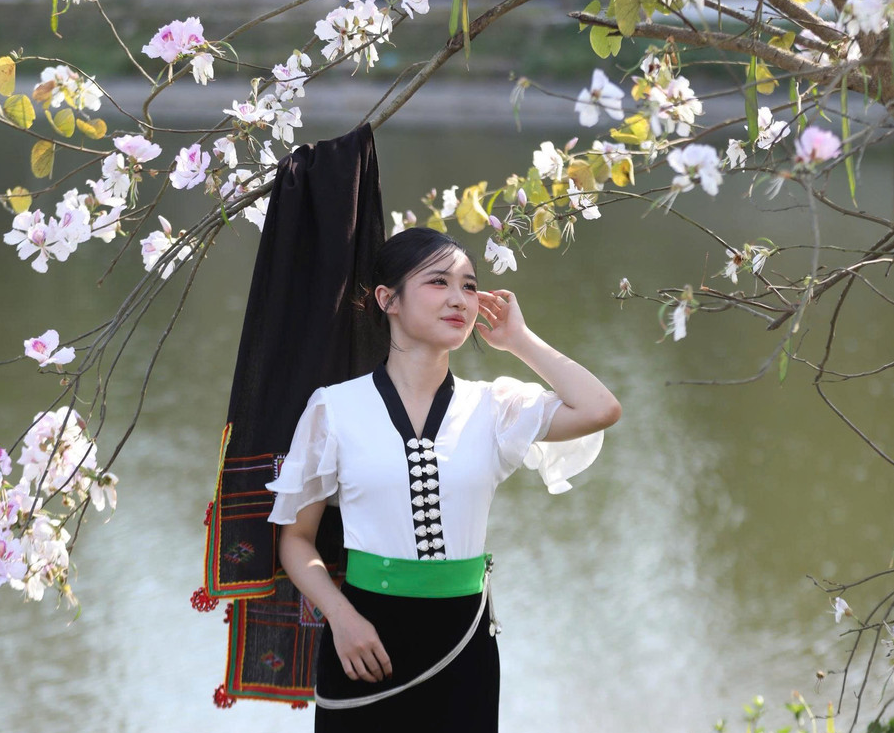 Thiếu nữ Điện Biên duyên dáng tạo dáng bên sắc trắng hoa ban.