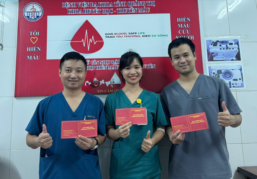 Hai bác sĩ và một điều dưỡng kịp thời hiến máu để cứu bệnh nhân. (Ảnh: BV Quảng Trị)