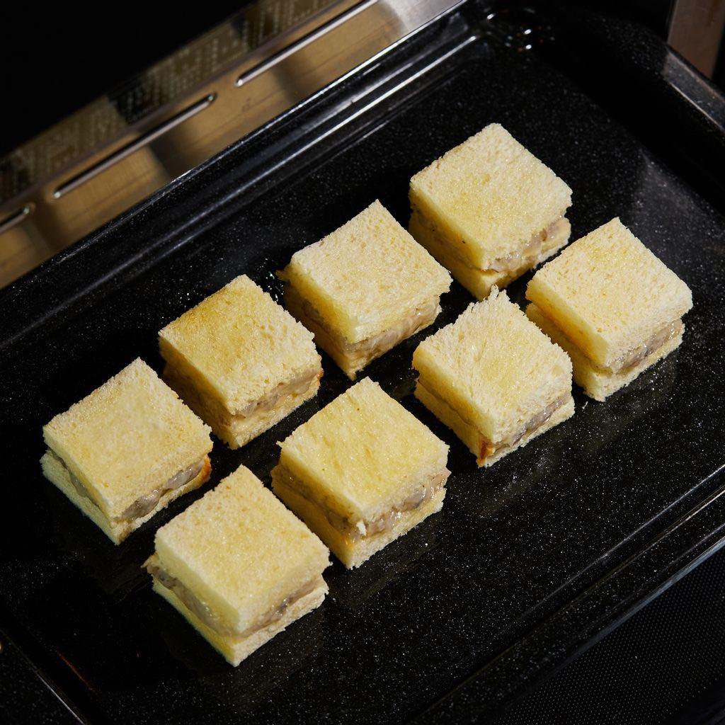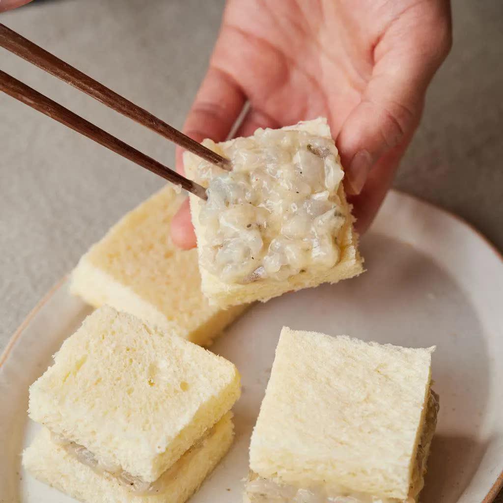 Bước 4: Bánh mì gối dùng dao cắt bỏ các mép cứng. Tiếp theo chia từng miếng thành 4 phần bằng nhau. Sau đó cho nhân tôm vào một mặt bánh mì rồi phủ kín bằng một miếng bánh mì khác.