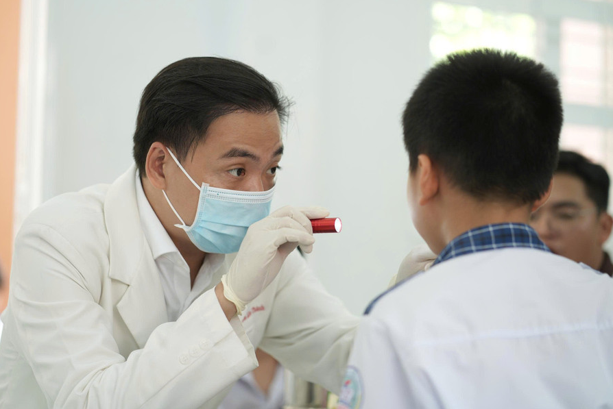 Bác sĩ khám và tư vấn sức khỏe răng miệng cho học sinh tại chương trình.