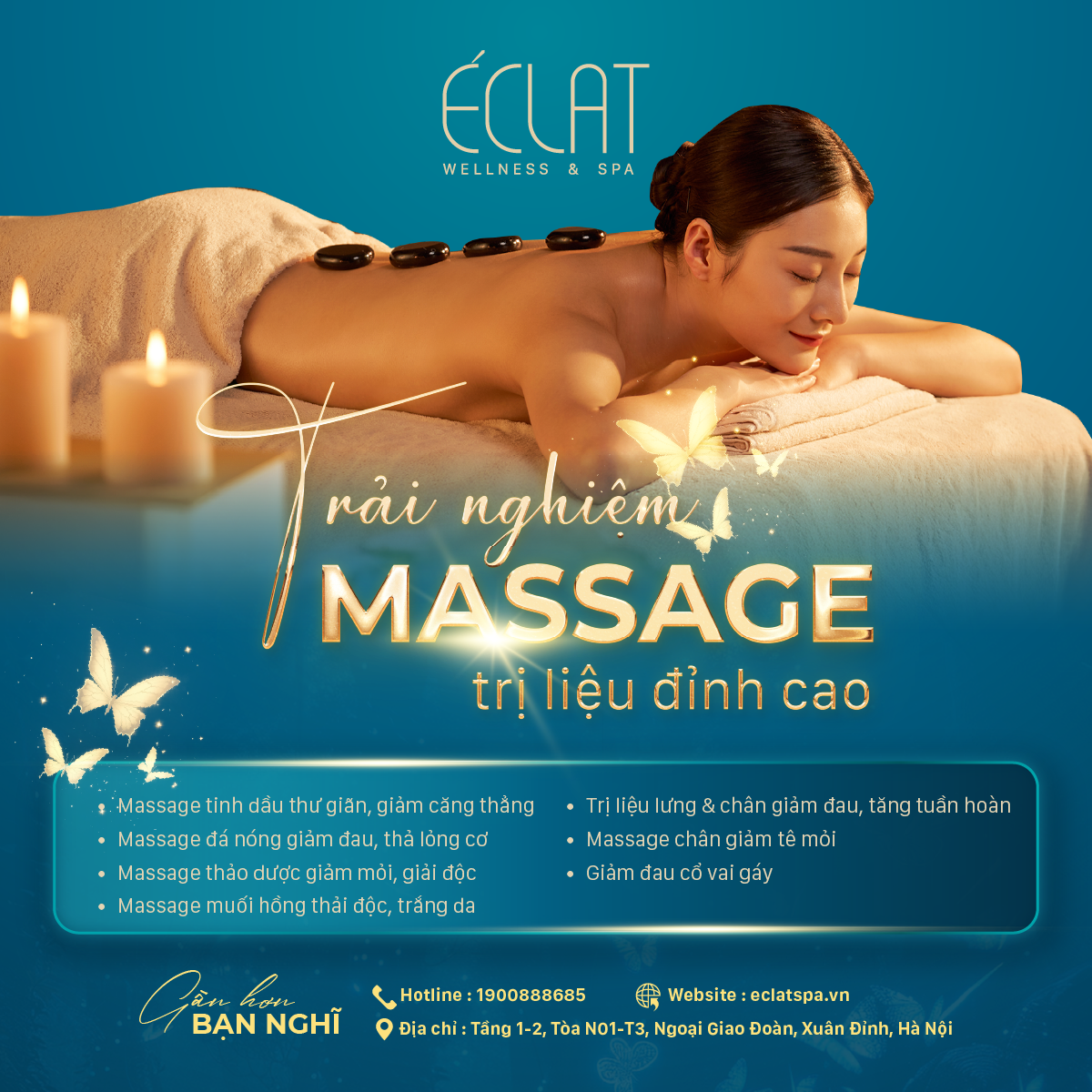Massage body tại ÉCLAT giúp thả lỏng cơ thể, giảm đau mỏi, lưu thông khí huyết và cân bằng cảm xúc trong không gian spa cao cấp, riêng tư và thư giãn tuyệt đối.