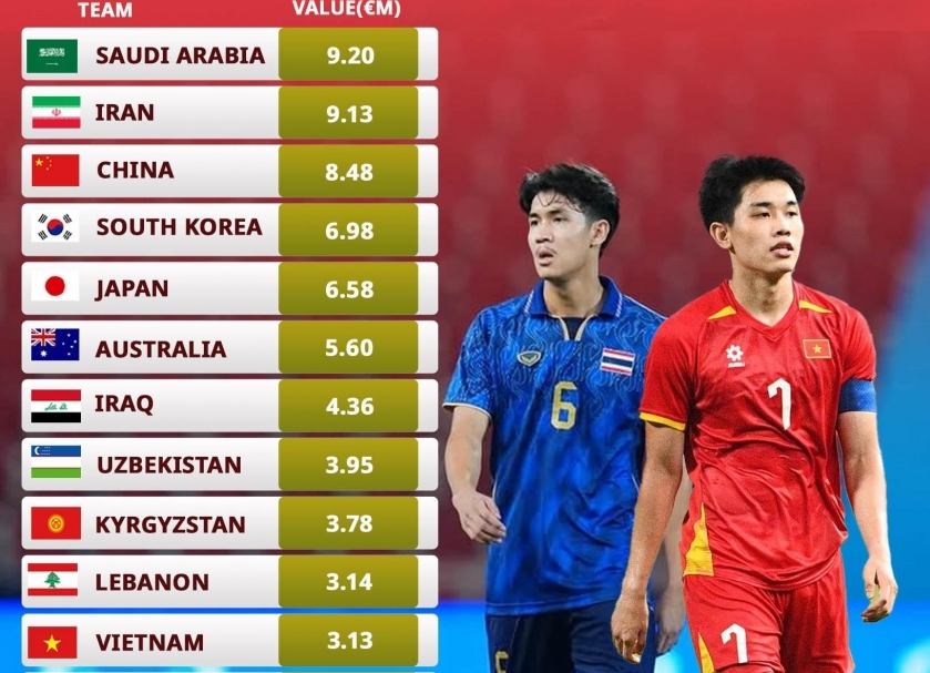 Theo thống kê của Transfermarkt, U23 Việt Nam có tổng giá trị đội hình 3,13 triệu euro, xếp thứ 11/16 đội tại Vòng chung kết U23 châu Á 2026 và cao gấp hơn 2 lần so với U23 Thái Lan (1,45 triệu euro, xếp thứ 15).
