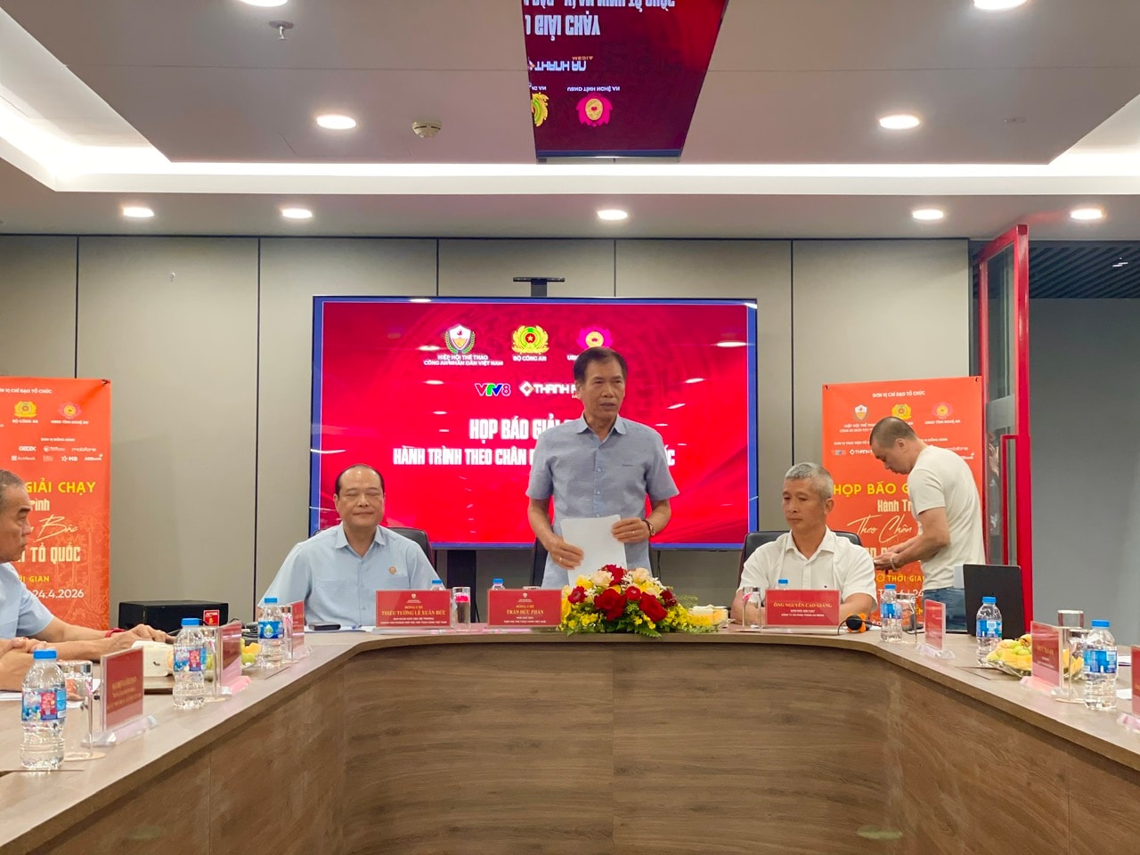 Phó Chủ tịch Hiệp hội Thể thao Công an nhân dân Việt Nam Trần Đức Phấn (giữa) thông tin về giải chạy tới báo chí. Ảnh: Ngân Hà