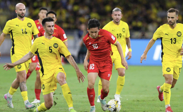 Tuyển Malaysia (áo vàng) có thể bị xử thua, tước quyền tái đấu tuyển Việt Nam tại vòng loại Asian Cup 2027
