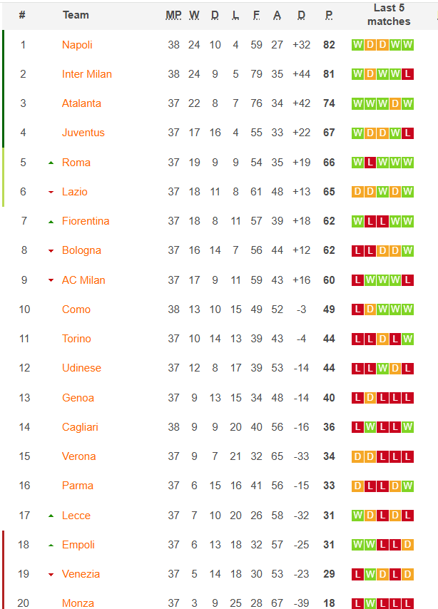 Về phần Napoli, chức vô địch Serie A 2024/25 là lần thứ 4 đội chủ sân Diego Armando Maradona đăng quang tại sân chơi cao nhất Italia. Đáng chú ý trong 15 mùa giải Serie A gần nhất, đây mới là lần thứ hai chủ nhân của danh hiệu Scudetto được xác định sau vòng đấu cuối cùng.
