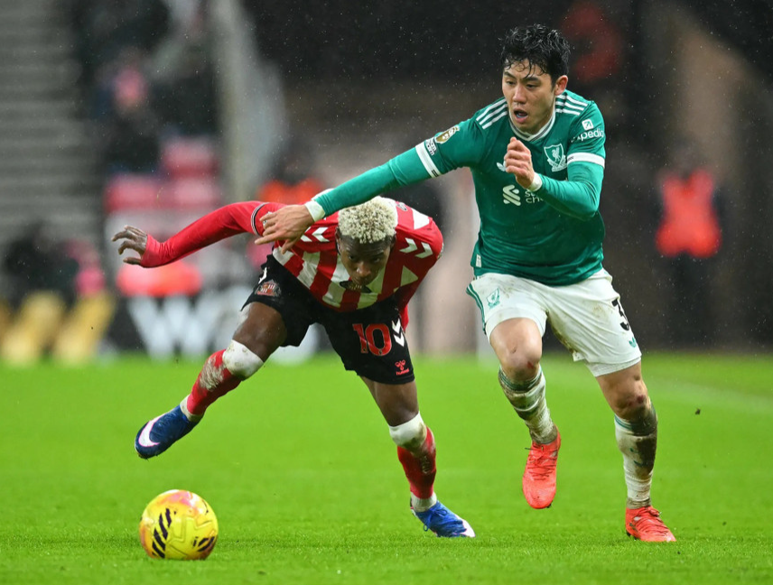 Tiền vệ Wataru Endo đau đớn che mặt khi rời sân trên cáng khiến trận Sunderland – Liverpool buộc gián đoạn giữa hiệp hai.