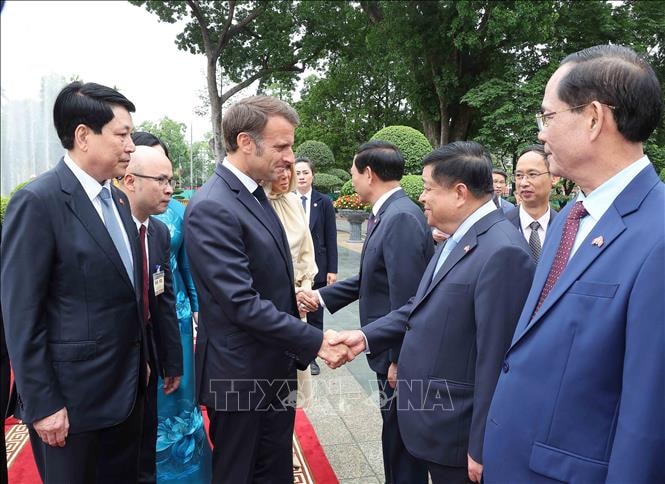 Đoàn xe hộ tống đưa Tổng thống Emmanuel Macron và Phu nhân tiến vào Phủ Chủ tịch, Chủ tịch nước Lương Cường và Phu nhân có mặt tại thảm đỏ nồng nhiệt chào đón Tổng thống Emmanuel Macron dẫn đầu Đoàn cấp cao Cộng hòa Pháp thăm cấp Nhà nước đến Việt Nam. Sau đó, các cháu thiếu nhi Thủ đô tiến tới trao tặng Tổng thống Emmanuel Macron và Phu nhân những bó hoa tươi thắm.