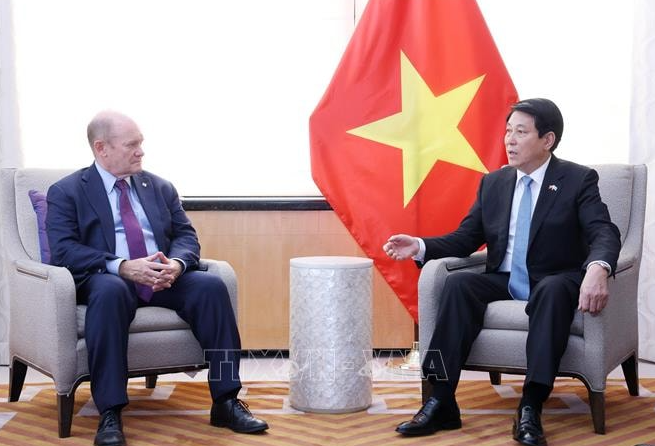 Trong khuôn khổ các hoạt động tham dự Phiên thảo luận chung cấp cao Đại hội đồng Liên hợp quốc khóa 80 kết hợp hoạt động song phương tại Hoa Kỳ, chiều 23-9 (giờ địa phương), Chủ tịch nước Lương Cường đã tiếp Thượng nghị sĩ Chris Coons - Thành viên cấp cao Ủy ban Đối ngoại Thượng viện Hoa Kỳ, Hạ nghị sĩ Brian Mast - Chủ tịch Ủy ban Đối ngoại Hạ viện Hoa Kỳ và Hạ nghị sĩ Young Kim - Chủ tịch tiểu ban Ấn Độ Dương-Thái Bình Dương.