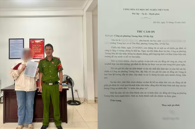 Ngày 24/10/2025, chị N.N.N (SN: 1984, trú tại phường Tương Mai, Hà Nội) đã gửi thư cảm ơn tới Công an phường Tương Mai, Công an thành phố Hà Nội, sau khi con trai chị là cháu N.H.G được lực lượng Công an phường tận tình hỗ trợ tìm kiếm và đưa trở về đoàn tụ cùng gia đình.