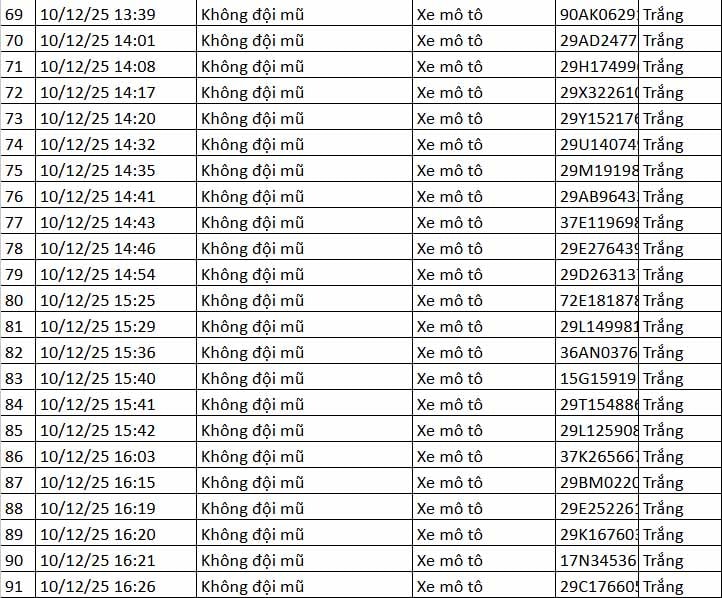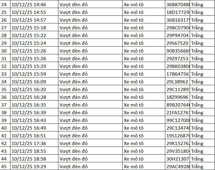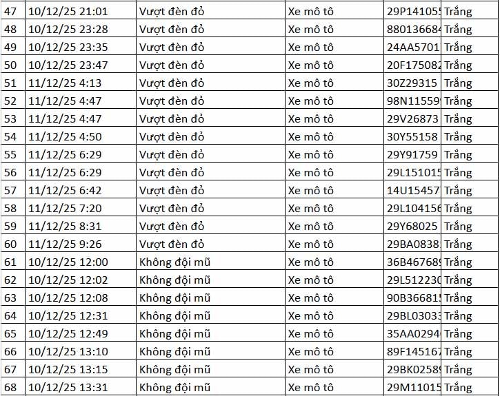Theo đó, từ 12h ngày 10-12-2025 đến 12h ngày 11-12-2025, hệ thống đã phát hiện 52 trường hợp không đội mũ bảo hiểm và 79 trường hợp không chấp hành hiệu lệnh của đèn tín hiệu giao thông (vượt đèn đỏ). Hệ thống ghi nhận không có trường hợp nào đi ngược chiều trong khoảng thời gian này.
