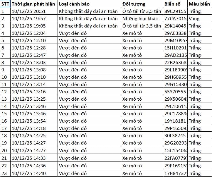 Thông tin từ Cục Cảnh sát giao thông (CSGT) - Bộ Công an, trong khoảng thời gian từ 12h ngày 10-12-2025 đến 12h ngày 11-12-2025, hệ thống camera ứng dụng trí tuệ nhân tạo (AI) tiếp tục phát huy hiệu quả trong giám sát, phát hiện vi phạm giao thông trên địa bàn Hà Nội và tuyến cao tốc Nội Bài - Lào Cai.