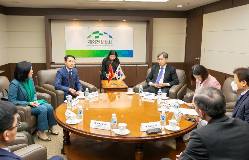 Tại Hàn Quốc, sáng 17-11-2022, Đoàn công tác có buổi gặp và làm việc với ông Kim Sang Mun, Trợ lý Bộ trưởng - Cục trưởng Cục Chính sách xây dựng của Bộ Đất đai, Cơ sở hạ tầng và Giao thông Hàn Quốc (MOLIT) tại trụ sở Hiệp hội Xây dựng quốc tế Hàn Quốc (ICAK).