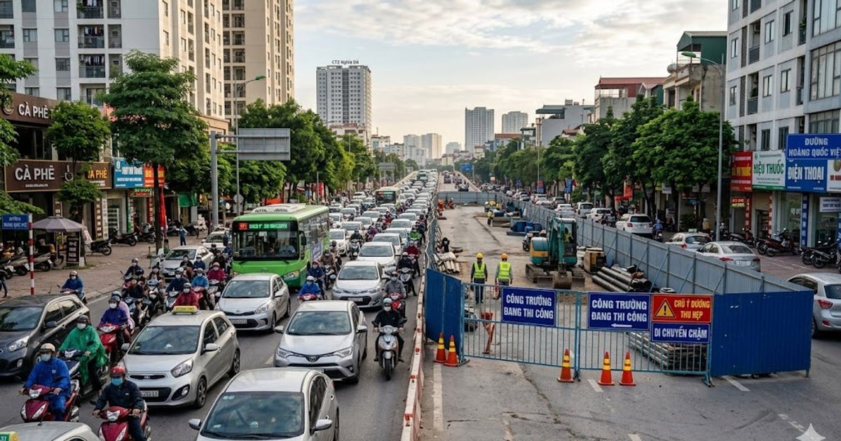Tại tuyến Hoàng Quốc Việt – Hoàng Hoa Thám, giao thông ghi nhận mật độ phương tiện đông và di chuyển chậm. Nguyên nhân chủ yếu do khu vực vòng xuyến Hoàng Quốc Việt đang có công trình thi công, khiến lòng đường bị thu hẹp, làm giảm khả năng lưu thông của các phương tiện.