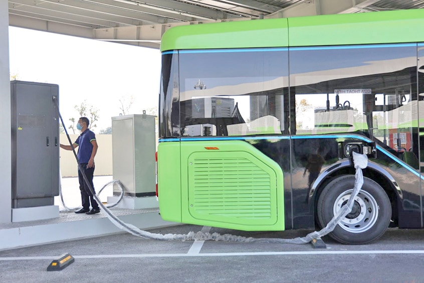 Sạc điện tại trạm sạc xe buýt điện Vinbus. Ảnh: Ngọc Huy