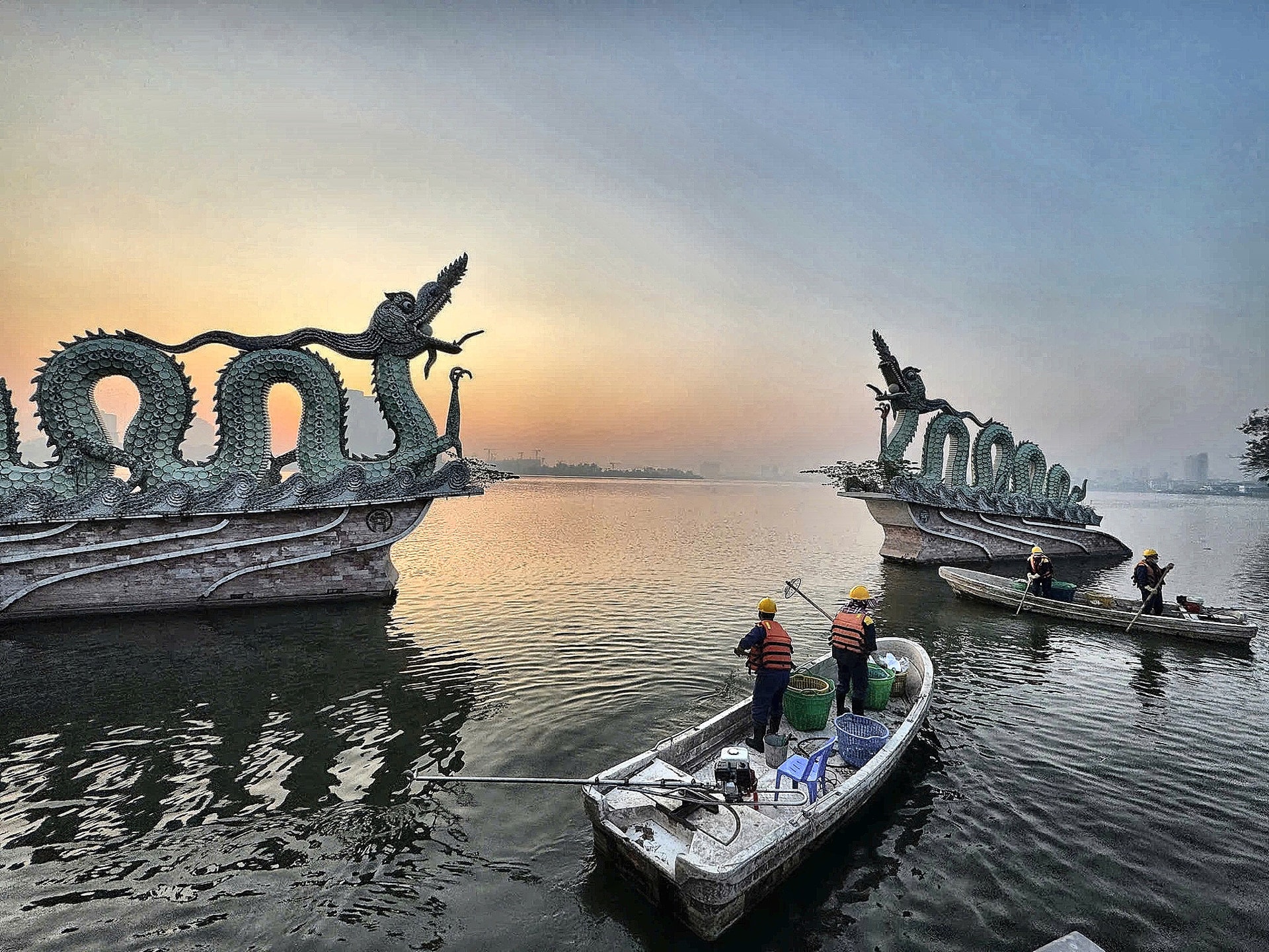 Công nhân Xí nghiệp Thoát nước số 1 làm vệ sinh trên hồ Tây. Ảnh: Thanh Tú