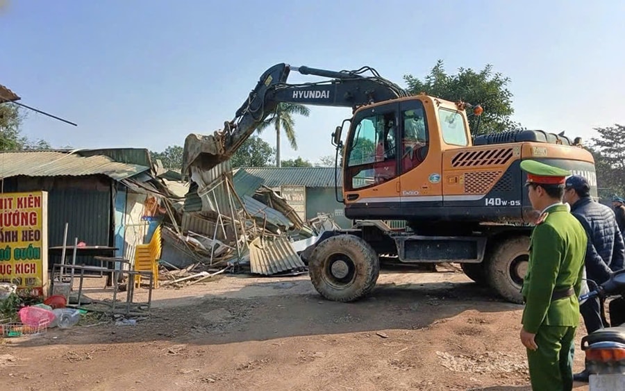 Lực lượng chức năng xã Hòa Lạc tiến hành giải tỏa chợ cóc, chợ tạm trên địa bàn.