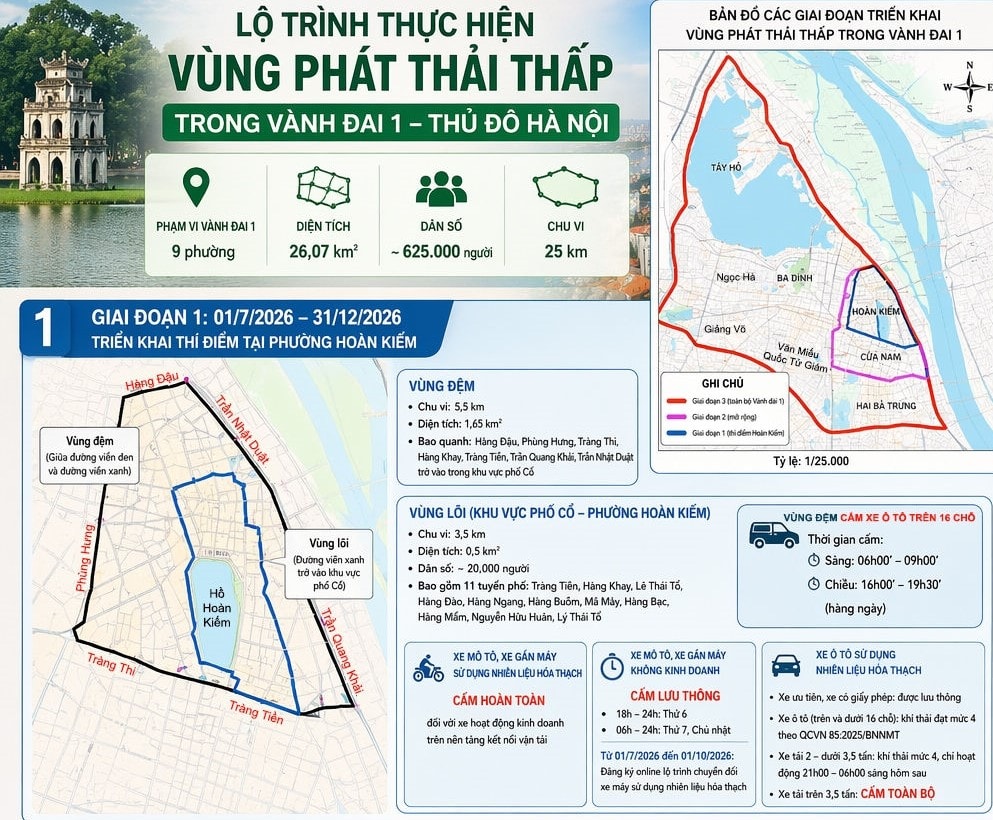 - Tinh thần chung là triển khai thận trọng, có lộ trình, không gây xáo trộn lớn đối với đời sống dân sinh và hoạt động kinh tế. Giai đoạn từ ngày 1-7 đến hết năm 2026, thành phố thí điểm tại một số khu vực trọng điểm thuộc vùng lõi trung tâm và bao quanh 11 tuyến phố cạnh hồ Gươm (Tràng Tiền, Lê Thái Tổ, Mã Mây…), trong đó phường Hoàn Kiếm là khu vực được nghiên cứu ưu tiên triển khai trước. Báo cáo đề án cũng xác định vùng đệm khoảng 1,65km²; từ 1-1-2027, mở rộng thí điểm bao gồm 14 tuyến phố, dân số khoảng 137.000 người, diện tích 3,6km2; từ 1-1-2028 áp dụng toàn vành đai 1 gồm 9 phường nội đô lịch sử, diện tích 26,07km2…