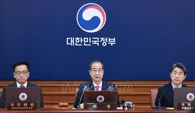 Quyền Tổng thống Hàn Quốc Han Duck-soo (giữa) chủ trì cuộc họp nội các về bầu cử tại Seoul ngày 8-4-2025. Ảnh: YONHAP/TTXVN
